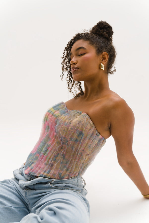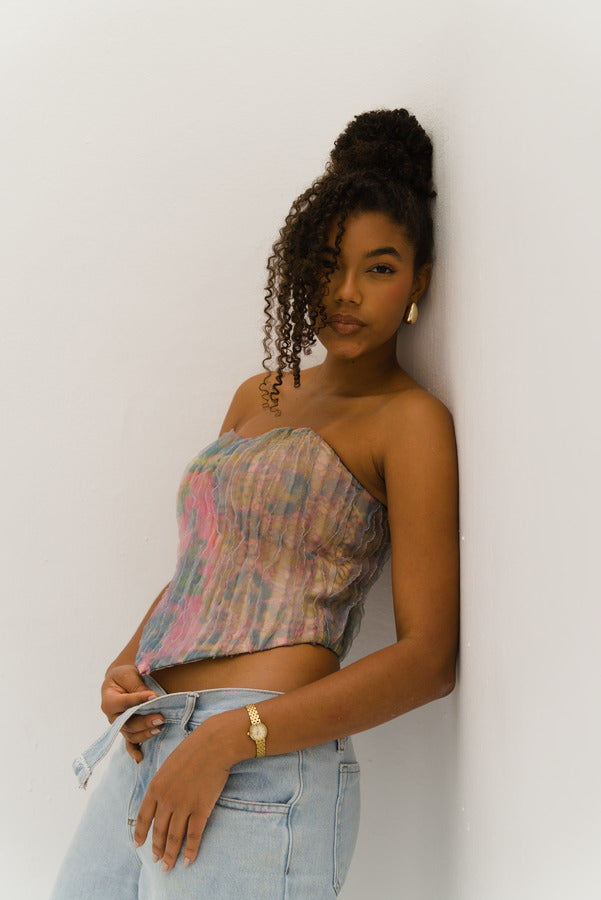 Stand out with Chica, a heart-shaped corset top that blends luxury with playful elegance. Made from a silky satin lining overlaid with a unique, multicolored patterned tulle, Chica adds a touch of whimsy with its sheer, ruched texture. The structured V-shaped waist aong with its boning offers a flattering, snatched look that highlights your silhouette. This top is perfect for making a memorable impression at any special event.