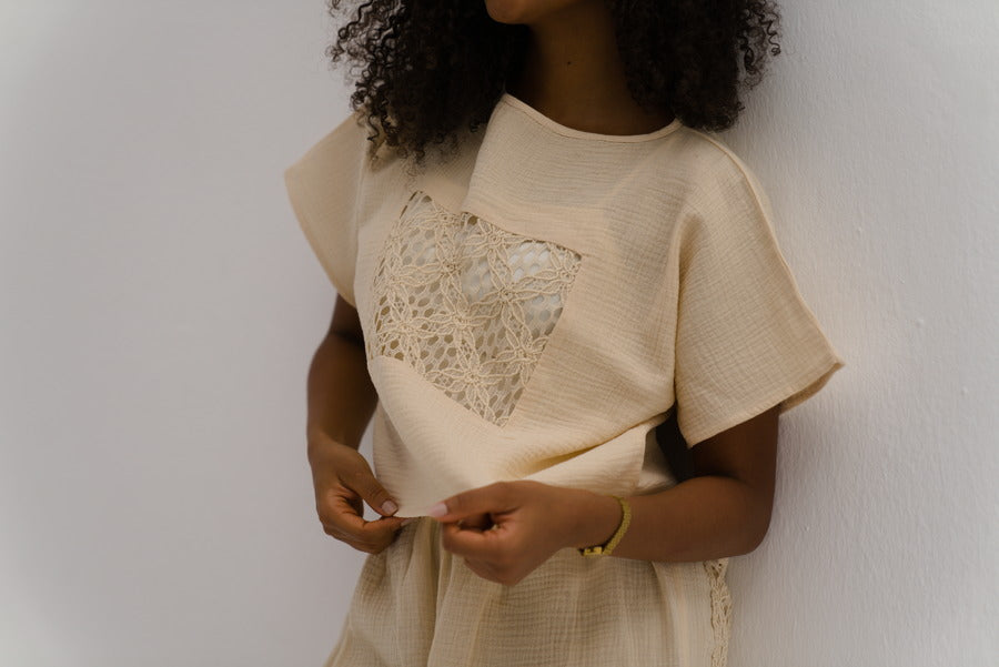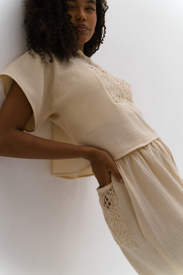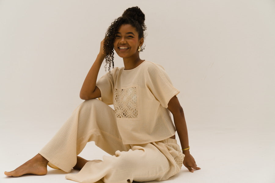 Our best selling Estrella set is back with an upgrade! Now in soft cotton linen blend fabric with the same crochet detail, perfect for lounging, beach or even errands. In its flattering cream color that suits all skin-tones.